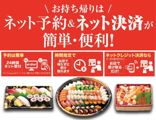 フェアのお寿司はお持ち帰りも可能です!ご家庭、オフィスなどでお店の味をぜひお楽しみください。アトムのテイクアウトサイトよりネット予約&ネット決済がご利用いただけます。