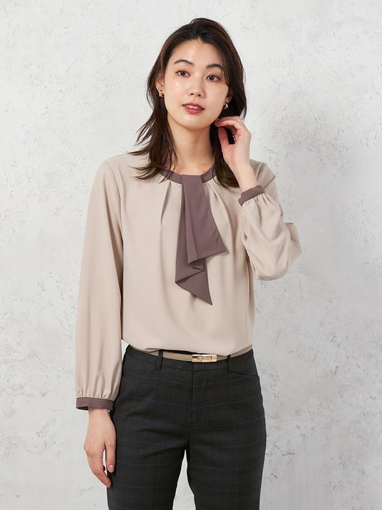 取り外し可能なボウタイ付きで気分によってスタイリングを変えられる『配色ボウタイ2WAYブラウス』とデコルテ周りのドレープが顔周りをすっきり見せてくれる『ドレープネックブラウス』の派手すぎない華やかさが着こなしやすい2デザインをご用意いました。