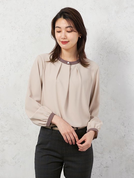ストレッチ素材で動きやすく、ジャケットから袖が見えない9分丈仕上げもオフィスウェアならではのディテールで、これからの季節に活躍するブラウスとなっております。