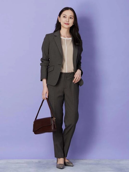人気のチェック柄を採用した“デレガント ミニチェックセットアップ”はシーズンカラーのブラウンとベーシックなネイビーの二色展開で、テーラードジャケット、テーパードパンツ、フレアスカートご用意しました。キャリア女性が気兼ねなくオフィススタイリングに取り入れていただけるよう可愛くなりすぎないデザインにこだわり“大人が楽しむ秋のチェック柄”スーツに仕上げました。全体的にすっきりとしたシルエットがきちんと感を演出し、お仕事着としてシーンレスにご着用いただけます。