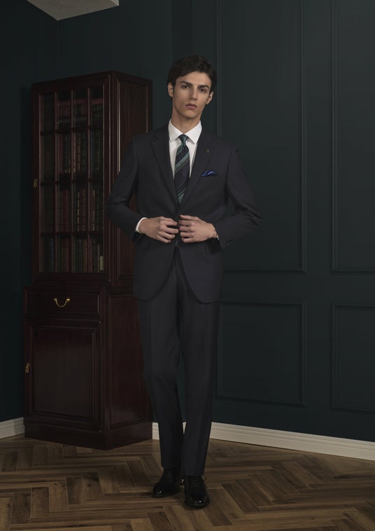 30代のビジネスパーソンのリアルクローズを意識し、かっちりとしたイメージのブリティッシュスタイルをアップデートしトレンドを落とし込むことで、ベーシックなスタイルかつ洗練された印象を演出するビジネススーツをご用意しました。胸ポケット裏地は、ブランドカラーのロイヤルブルーを採用しポケットチーフになる仕様にし、ラペルピンは英国国花のローズをモチーフに、さらに裏地箇所はKATHARINE HAMNETTのアーカイヴから採用したネクタイと同柄のマルチストライプパターンを使用し、細部までデザインにこだわりました。
