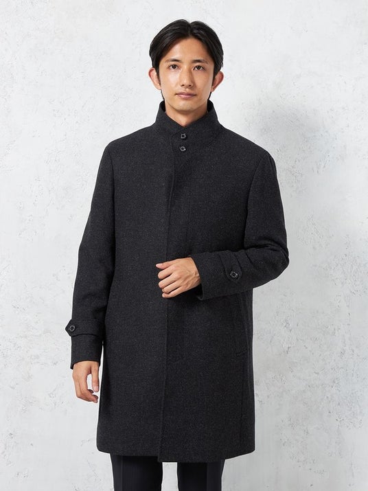 アウター素材として人気のブリティッシュウールを採用したスタンドカラーコートを、現代風にアップデートした一着です。軽さと暖かさを兼備したベーシックなデザインに仕上げました。単調ではなくミックス感のあるカラー調のため、カジュアルなテイストのスタイリングからビジネスのかっちりスタイリングまで幅広いシーンでご着用いただけます。