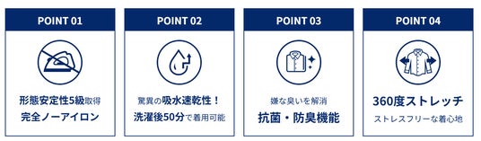 「i-Shirt」は、シワになりにくくアイロン掛け不要の「完全ノーアイロン*1」で、夜にお洗濯をして翌朝には着用できる「吸水速乾機能」、部屋干しに対応した「抗菌防臭機能」、ニット素材を採用した高いストレッチ性によるスポーツウェアのような着心地を兼備しています。時短&簡単ケアとルームウェアのような楽な着心地で仕事もプライベートも充実させるビジネスパーソンのライフスタイルをサポートします。