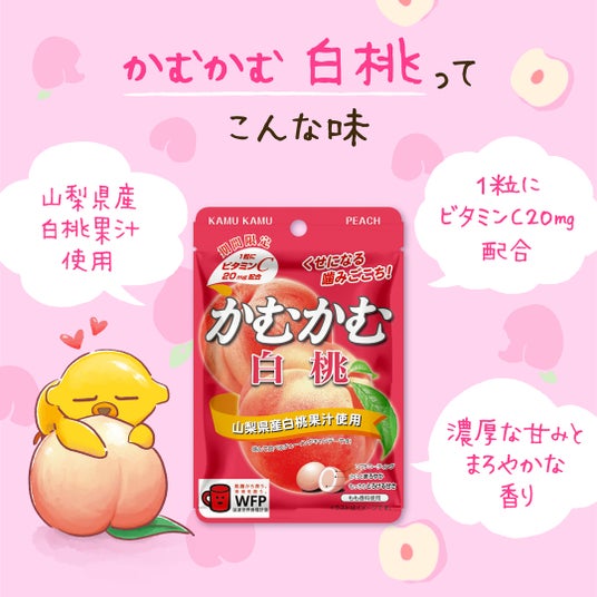 「かむかむ」の期間限定品は、柑橘系・炭酸飲料系のフレーバーを中心に展開していますが、今回は「果実の甘み」にこだわった商品です。山梨県産白桃果汁を使用し、果実の味わいを手軽にお菓子で感じて頂きたいという想いで作りました。何粒でも食べられる味わいに仕立てています。