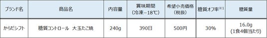 幅広い年代の方に人気のたこ焼ですが、小麦粉から作られるため意外にも糖質が多い食品の一つです。糖質を気にする方に向けて、小麦粉の一部を糖質が低く、たんぱく質や食物繊維の多い大豆粉に置き換え「大玉たこ焼」を開発しました。薩摩産かつおぶしの出汁と国産キャベツ、ネギを使用。1個30gで食べ応えがあります。