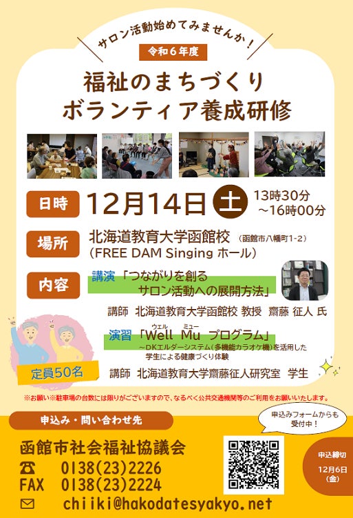 また、12月14日には、同ホールにおいて、社会福祉協議会と連携した福祉のまちづくりボランティア養成研修(北海道教育大学函館校 齋藤教授の講演とWell Muプログラムの演習)も実施されます。