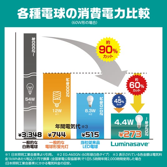 ※2一般的な白熱電球の消費電力を54Wと、ルミナセーブ電球昼白色モデルLSF-A60N 4.4W から算出した電気料金比較。電気料金算出条件は※1と同じ。