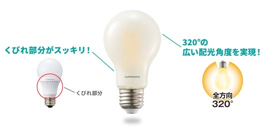 光源にフィラメントLEDを採用しており、従来のLED電球のような大きな放熱機構を必要としないため、白熱電球と同じ320度という全方向タイプの配光角度を実現しました。全方向に光が届くため、リビングやペンダント用等、従来のLED電球にはできなかった全体を照らす場面にも最適です。また、電球のくびれ部分が白熱電球と同じ形のため、従来のLED電球ではくびれが邪魔をして取り付けることができなかった器具にも取付可能です。(一部の器具を除く)