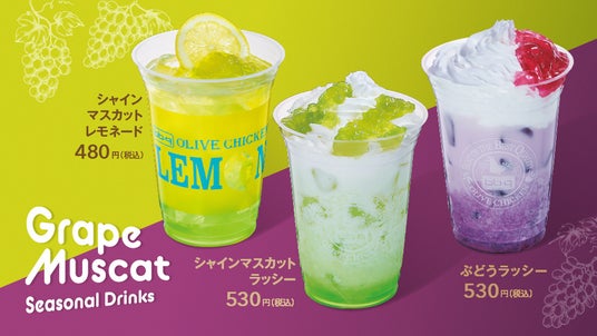 『bb.q オリーブチキンカフェ(以下、オリーブチキンカフェ)』は、9月5日(木)より2024年秋の新作ドリンクとして「ぶどうラッシー」(530円税込)「シャインマスカットラッシー」(530円税込)「シャインマスカットレモネード」(480円税込)販売いたします。