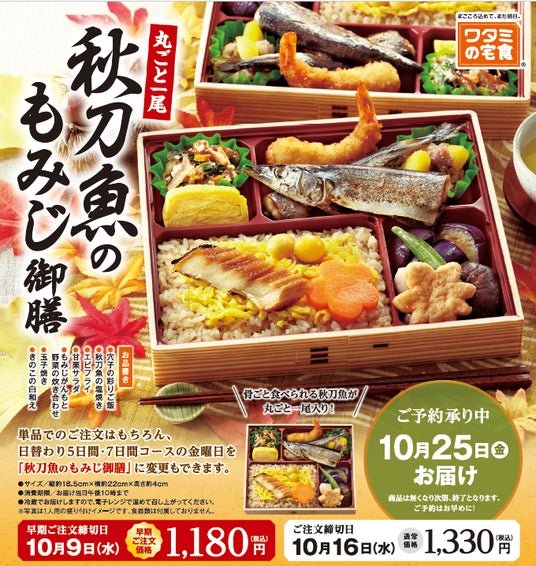 ワタミ株式会社(本社:東京都大田区、代表取締役会長 兼 社長CEO:渡邉 美樹、以下「ワタミ」)が運営する食事宅配サービス「ワタミの宅食」は、季節限定の特別弁当として「秋刀魚のもみじ御膳」を9月19日(木)より販売開始いたします。