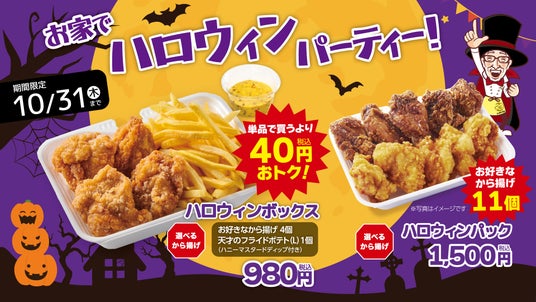 揚げたてから揚げとテリー伊藤こだわりの玉子焼き「から揚げの天才」は、2024年10月1日(火)から1か月間の期間限定で1,020円(税込)相当の選べるから揚げ&フライドポテトのパック「ハロウィンボックス」を40円おトクな980円(税込)、通常1,650円相当の選べるから揚げが11個も入ったボリュームたっぷり「ハロウィンパック」を150円おトクな1,500円(税込)で販売いたします。