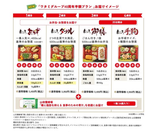 ・対象商品:1週目「まごころおかず」、2週目「まごころダブル」、3週目「まごころ御膳」、4週目「まごころ手鞠」、山田養蜂場「糖と脂肪を抑える 食事のための青汁」1箱(30袋入り) ※お弁当・お惣菜の献立は日替わりで、月~金の5日間お届けします。