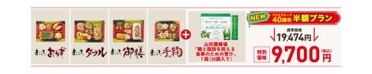プランの内容は、お弁当・お惣菜20日分に山田養蜂場「糖と脂肪を抑える 食事のための青汁」1箱(30袋入り)をお付けして通常価格19,474円(税込)を半額以下の9,700円(税込)でご自宅までお届けいたします。