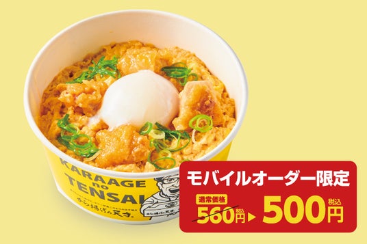 揚げたてから揚げとテリー伊藤こだわりの玉子焼き「から揚げの天才」は、モバイルオーダー限定割引きで人気のワンコインシリーズから新しく「特製タレ使用 マヨから丼」500円 (税込)を販売致します。