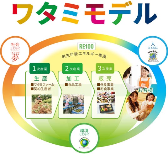 ワタミファームで採れた有機野菜(1次産業)は、ワタミ手づくり厨房で加工(2次産業)され、ワタミグループの外食事業や宅食事業(3次産業)をつうじて、全国のお客様に提供されています。 持続可能な循環型社会の構築を目指すワタミグループでは、環境負荷を軽減するための取り組みや、再生可能エネルギー事業として発電設備の開発・建設・運転管理にも取り組んでいます。 この一貫統合された“独自の6次産業モデル”が、ワタミグループの事業を成長させ、さらにあたらしい事業領域の可能性を広げています。