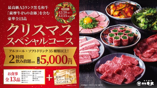 ワタミ株式会社(東京都大田区、以下ワタミ)が展開する「和牛焼肉 築地牛武」練馬店では、12月20日(金)~12月25日(水)の6日間限定で、最高級A5ランク和牛”薩摩牛4%の奇跡”を含む全13品、120分飲み放題(生ビール含むアルコール・ソフトドリンク約35種類以上)&乾杯スパークリングワインが付いた「クリスマススペシャルコース」をお1人様5,000円(税込)で販売いたします。こちらは大好評の「焼肉宴会コース」のクリスマスプランとなり、大変お得にお楽しみいただけます。