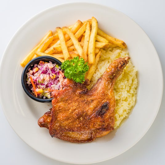 “長州どり”の骨付きもも肉を骨ごとじっくりとローストして柔らかく仕上げ、ケイジャンスパイスで風味豊かに仕上げました。フレンチフライとコールスロー付き。
