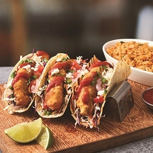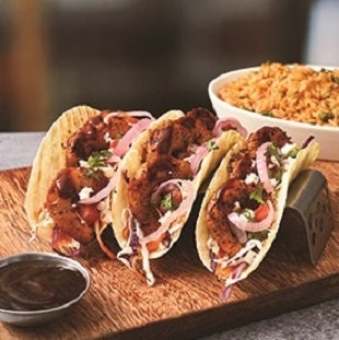 アイオリソースを塗ったフラワートルティアにコールスローを盛り付け、サクサクに揚げたチキンフィンガーにBBQソースで味付け。ピコデガヨ、カッテージチーズ、レッドオニオンピクルス、パクチーをトッピング。トマト風味のスパニッシュライス付き。