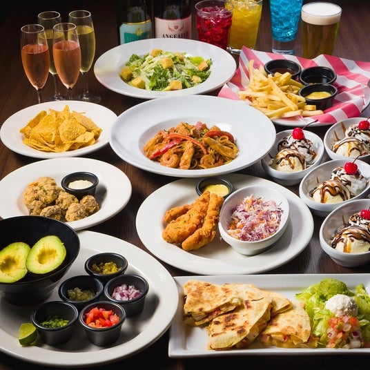 シーザーサラダ・ガカモレ&チップス・フライデーズ マッシュルーム・チキン ケサディア・コールスロー・チキンフィンガー・ケイジャンシュリンプ&チキン パスタ・フライデーズフライ & 3種ディップ(おかわり自由、フライデーズシグネチャーソース・BBQソース、ハニーマスタードの3種のディップ付き)・ミニサンデー(レディースパーティーコース限定)