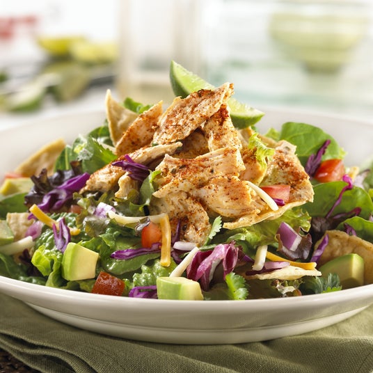 ロメインレタス、紫キャベツ、レッドオニオン、チェダーチーズ、モッツァレラチーズを特製のライムシアントロドレッシングで味付けし、オノガノ風味で味わい深く味付けしたチキンをトッピング。アボカド、トマトダイス、トルティアチップスでアクセントを加えました。ライムを絞ってさっぱりとお召し上がりください。