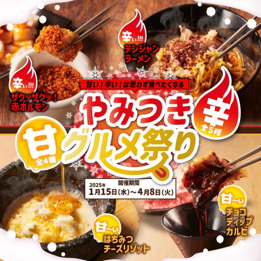 ワタミ株式会社(東京都大田区、以下ワタミ)と国内有数の和牛生産者であるカミチクグループ(鹿児島県鹿児島市)との合弁会社、ワタミカミチク株式会社(東京都大田区、以下ワタミカミチク)が展開する「かみむら牧場」は、2025年1月15日(水)から期間限定で、「やみつきグルメ祭り」として「チョコ・ディップ・カルビ」や「はちみつチーズリゾット」など4種の「甘いモノ」メニューと、「ザクッザクッ!赤ホルモン」や「テンジャンラーメン」など5種の「辛いモノ」メニューを「ジャストミートコース」以上の食べ放題コースで提供いたします。