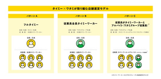 さらに今後、現場リーダーとしてタイミーで正社員採用されたタイミー社員やタイミーワーカーによる“フルタイミー”での店舗運営(図1、パターンA)も実施。4月24日オープン予定の「サブウェイ 新宿小田急ハルク店」にて営業を開始いたします。