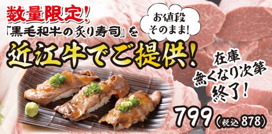 ・商品名:黒毛和牛の炙り寿司(※対象期間、近江牛にグレードアップ)