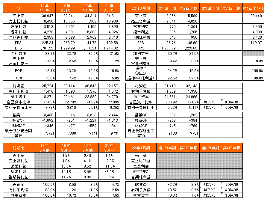 現状、予想PER9.22倍、PBR0.89倍、予想ROE9.73%、予想配当利回り3.36%、自己資本比率は77.67%で有利子負債比率5.41%。進捗率から考えると、通期では未達懸念があるが、それでも今の水準は安いような気がする。