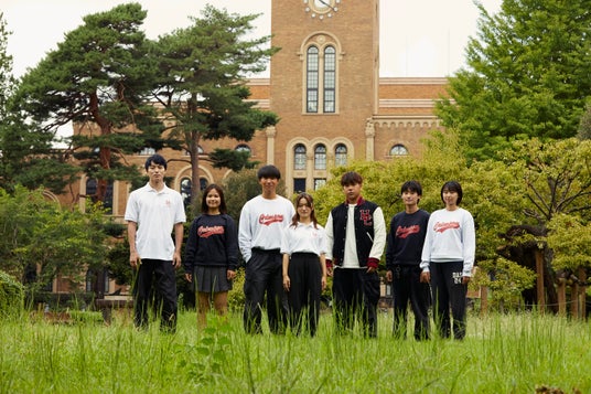 一橋大学構内にて撮影。「CRIMSON」チームの皆様に各アイテムを着用いただきました