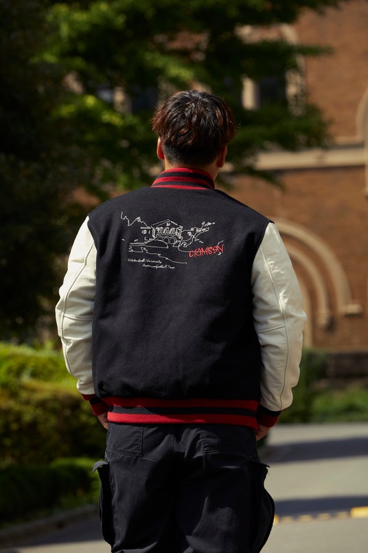 米国・ワシントン州発祥のブランド「Skookum(スクーカム)」とのコラボで、クラシックでトラディショナルな雰囲気が漂うスタジャンです。胸に「HITOTSUBASHI」「CRIMSON」の頭文字を取ったワッペンが、背中には一橋大学のシンボル・兼松講堂のデザイン画のプリントと、「CRIMSON」のロゴの刺繍が入っています。