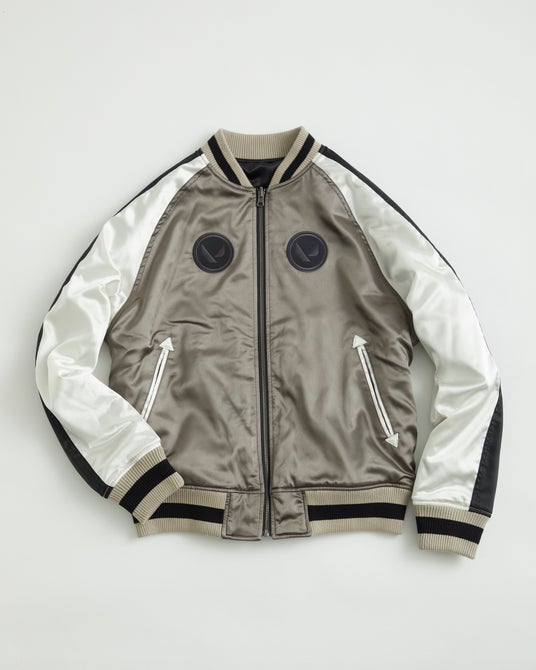 バックに「ONI(鬼)」を大胆に刺繍したスカジャン。光沢のあるサテン地、袖のパイピング、ラグランスリーブ、裾のリブの仕様など正統派な作りにVALORANTのモチーフを大胆に刺繍しました。胸にはVALORANTのロゴマークの刺繍入り。中綿入りで防寒性もあり、リバーシブル仕様、ボディカラーと刺繍を同系色でまとめることで幅広い着こなしが可能です。