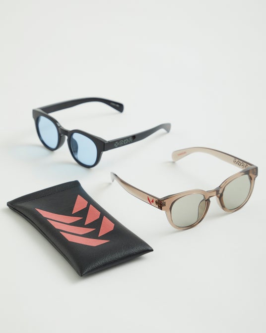 定番のブラックフレームにはブルーレンズを。ややクリア感のあるグレージュフレームには色を合わせたグレーレンズを。男女ともに掛けやすいサイズ感です。テンプルにはアイコンを配置しました。