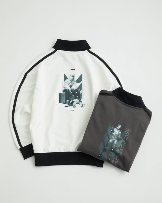 スタイルに変化を付けてくれるハーフジップスウェット。首まわりやリブ部分の切り返しや袖のラインなどが90年代を感じさせます。ルーズなシルエットながらバルーンシルエットを楽しめるバランスに仕上げました。バックには今回のキーであるエージェントのグラフィックとVALORANTのロゴを組み合わせたオリジナルデザインをプリントで表現。胸にはパーカーと同じくVALORANTの3連プリントをモノトーンでプリントしました。