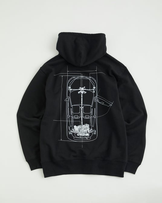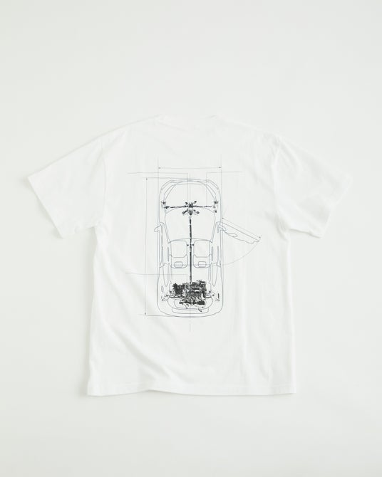 今回のために書き下ろされた「 GR ヤリスMコンセプト」の3面図をモチーフにしたグラフィックを、背中に大胆にシルクスクリーンでプリントしました。ポイントとなるエンジン部分にはプリントの上からさらにジェルプリントを施しています。