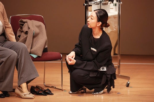 寺尾は2024年7月に開催された「渋谷ヒカリエ」大会において優勝、その後同 10月に行われた東京支部大会においても優勝し、全国大会への出場権を獲得しました。そして、全国大会では8分間の接客ロールプレイング審査において、社内異動を目前に控えたお客様から「雰囲気を変えたい、商談では取引相手に合わせて良いモノを身に付けていきたい」という要望を聞き出し、「新しい環境でぐっと背中を押すパートナー的なシューズを紹介します」と足元から気持ちを一新するようなパンプス2点を提案。異動間近で「気持ちが整ってくる時期ですね」と心情に寄り添い、お客様の印象を活かした服装やメイクのアドバイスも交え、新たなチャレンジを応援。さらに靴のケア用スプレーのご案内と自分は靴のケアも得意であることも伝え、今後につなげられるようなアピールも加えました。審査の結果、「ファッション・物販部門」で優勝。審査員から「立ち姿が素晴らしい。ブランドを体現していて、常にお客様中心。『自分が』ではなくお客様が何を求めているかを確実にとらえた、流れるような接客だった」という総評を得ました。