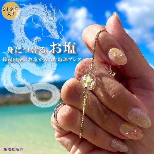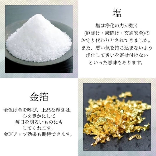 ・お塩意味塩珠に仕様されているお塩は、沖縄の龍神様に祈祷した厄除け・魔除け、交通のお守り代わりに持ち歩かれる天然の【島まーす】です。沖縄のお塩は浄化の力が強いといわれていてお守り代わりとして持ち歩く習慣があります。また持ち歩く事で悪い気を浄化し、災いをはねのける力があるといわれている大変貴重なお塩になります。・金箔意味金箔は風水でエネルギーを増幅させ、運気を向上させるといわれています。金は風水において富や成功、繁栄の象徴といわれ金運を呼び寄せてくれます。