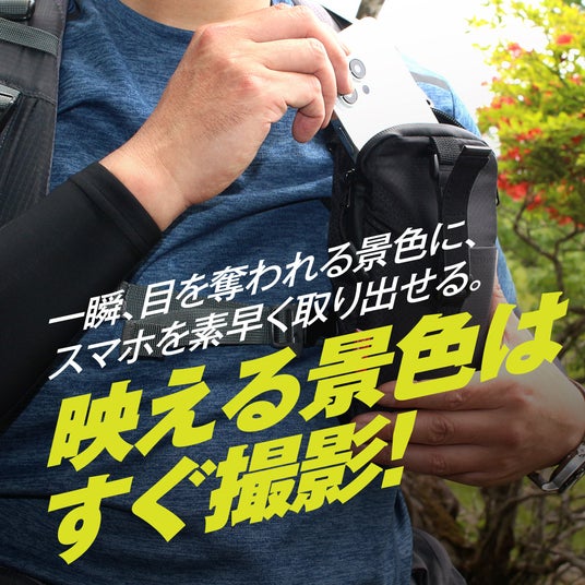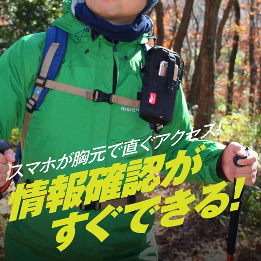 素晴らしい大自然を目の前にして、ついスマホで写真を撮りたくなるのが人情ですが、疲れているとその動作もままならない時があります。そんなとき胸元からスッとスマホが取り出せれば、ストレスフリーで写真撮影が可能です。