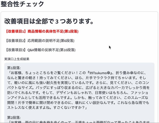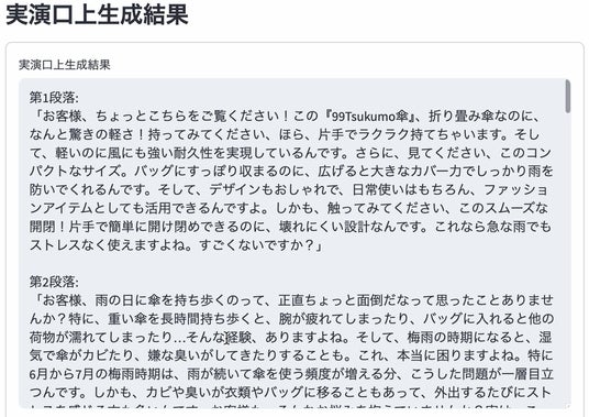 本システムは、弊社代表の吉村が著書『アキバ発! 売(バイ)の極意』で言語化した5つの販売メソッドをはじめ、コパ・コーポレーションが30年以上にわたり現場で蓄積した実演ノウハウを生成AIとして組み込みました。「商品名」「商品カテゴリ」「商品URL」「価格」といった簡単な情報を入力、商品パッケージ画像をアップロードするだけで、実演口上が即座に生成されます。生成される内容には、導入、課題提起、ストーリーテリング、行動喚起といった構成要素を網羅しており、説得力のあるトークを一貫して組み立てることが可能です。