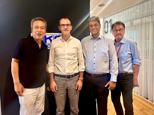 《並んで写真を撮る(株)東京衡機 代表取締役社長 小塚英一郎、Zwick Roell SE社CEO Klaus Cierocki氏、アジア部門責任者 Vinay Desai氏、並びに(株)ツビックローエル 代表取締役社長 山本勝三氏》