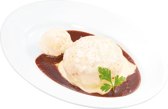 チーズソース入りのジューシーなハンバーグにさらにチーズをのせ、表面を香ばしく炙った一品です。デミグラスソースや、付け合わせの燻製ポテトとご一緒にお召し上がりください。