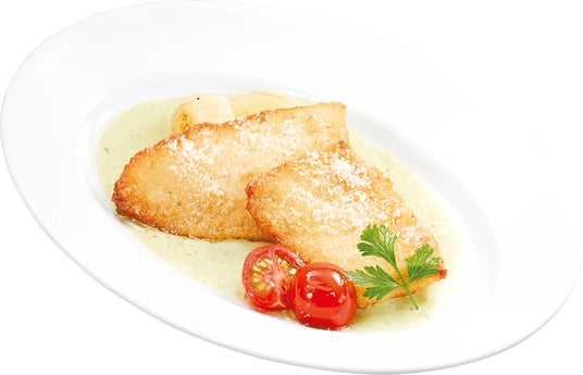 口に入れるとほろっとほぐれる黄金カレイを、パン粉焼きに仕上げました。表面が香ばしくサクふわな食感のカレイは、爽やかなバジルクリームソースと相性抜群です。