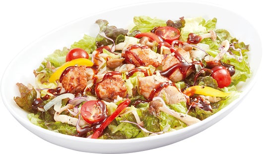 温かいグリルチキン、シメジ、エリンギなどのマリネをトッピングした、これからの季節にぴったりのサラダです。やわらかくジューシーなチキンや香り豊かなきのこ、香ばしいスモークバーベキューソースが食欲をかき立てます。