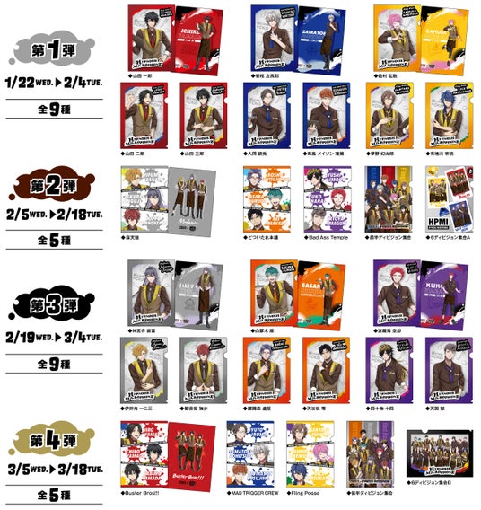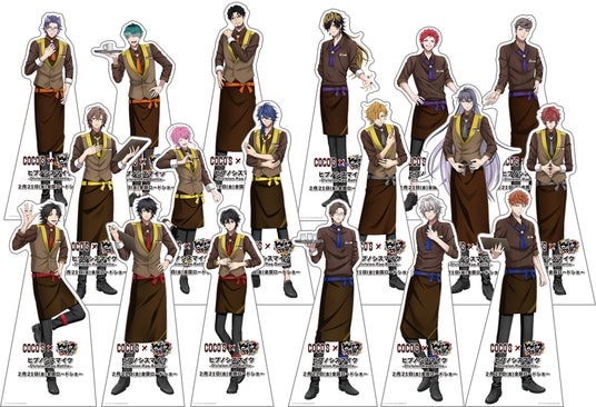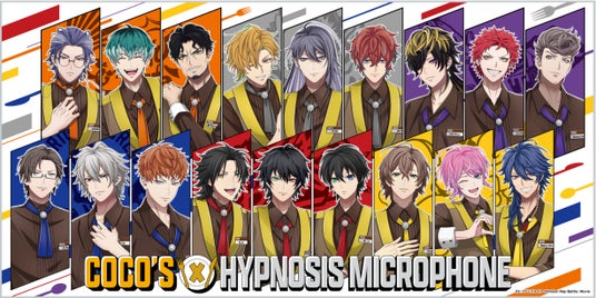 今回のコラボ企画では、『ヒプノシスマイク -Division Rap Battle-』の作品に登場する「Buster Bros!!!」「MAD TRIGGER CREW」「Fling Posse」「麻天狼」「どついたれ本舗」「Bad Ass Temple」の6ディビジョン、総勢18人のメインキャラクターが、ホールスタッフ風の衣装を着たオリジナルの描き下ろしイラストでキャンペーンを盛り上げます。