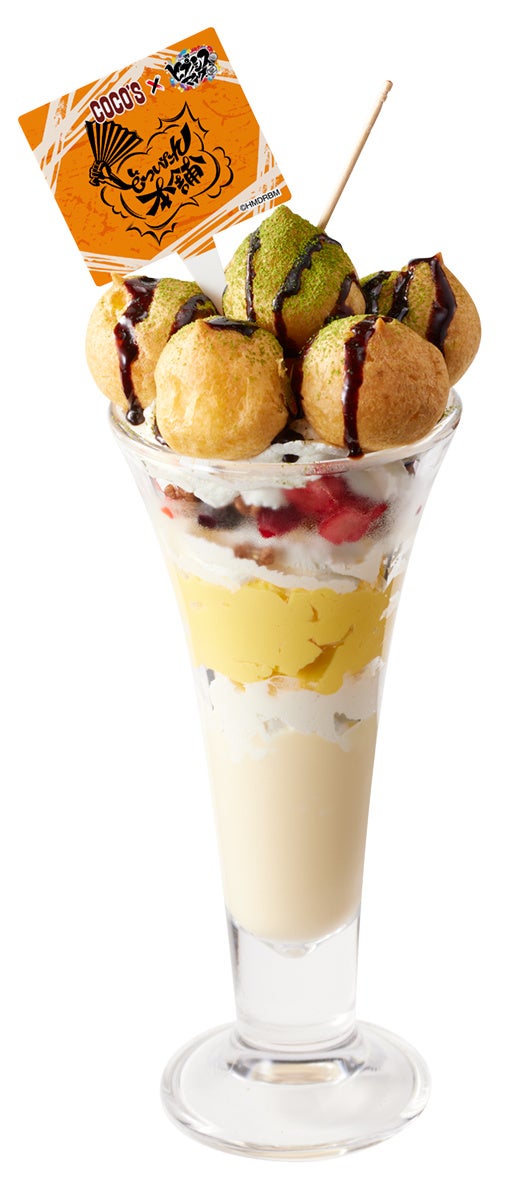 プチシュークリームにチョコレートソースと抹茶パウダーをかけて大阪名物のたこ焼きを表現した、見た目も楽しい豪華なパフェです。プチシュークリームには爪楊枝を刺し、一層たこ焼きらしい見た目に仕上げました。パフェを食べ進めると、まろやかな甘みのマンゴープリンと爽やかな味わいのフルーツヨーグルトが合わさり、ミックスジュースのような味わいをお楽しみいただけます。