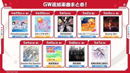 GW期間中にガルパ全8バンドによる楽曲が追加されます。