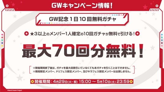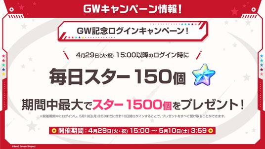 4月29日(火)15時~5月10日(土)3時59分までの間にゲームにログインしていただくと、その後、5月19日(月)3時59分までの期間中、1日1回ログインでスターを150個プレゼントいたします。