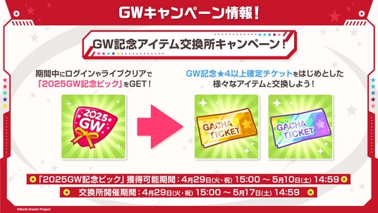 ログインやライブクリアで「2025GW記念ピック」を獲得することができ、集めた「2025GW記念ピック」を使って、交換所で、好きなアイテムと交換することができます。