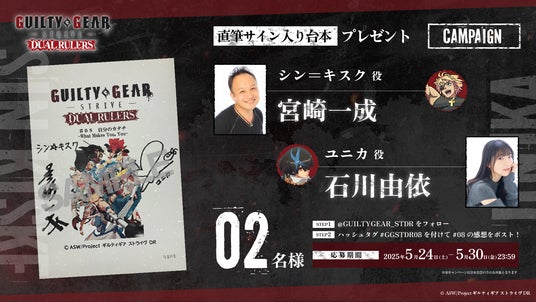 TVアニメ『GUILTY GEAR STRIVE: DUAL RULERS』#08放送を記念して、シン=キスク役 宮崎一成さんとユニカ役 石川由依さんのサイン入り#08台本を、2名様にプレゼントいたします。