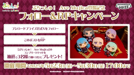 株式会社ブシロード(本社:東京都中野区、代表取締役社長:木谷高明)のグループ会社にあたる株式会社ブシロードクリエイティブ(本社:東京都中野区、代表取締役社長:成田耕祐)は、ミニクレーン向けの景品ブランド「たいにぃぎふと」より「ぷちっしゅ! Ave Mujica」を2025年5月23日(金)から順次展開いたします。