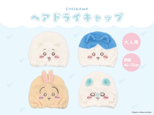 新商品は、ちいかわ・ハチワレ・うさぎ・モモンガの全4種展開です。柔らかく肌触りが良いふわもこ素材が濡れた髪を優しく包み込みながら水分をしっかり吸収。可愛さと、時短&手軽なヘアケアを両立した便利なアイテムです。頭囲46~75cmまで対応するフリーサイズ設計で、幅広い方にお使いいただけます。
